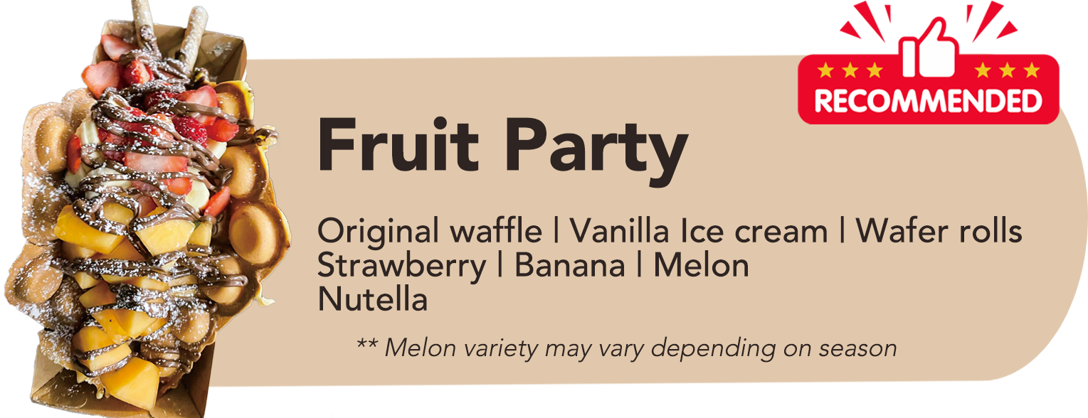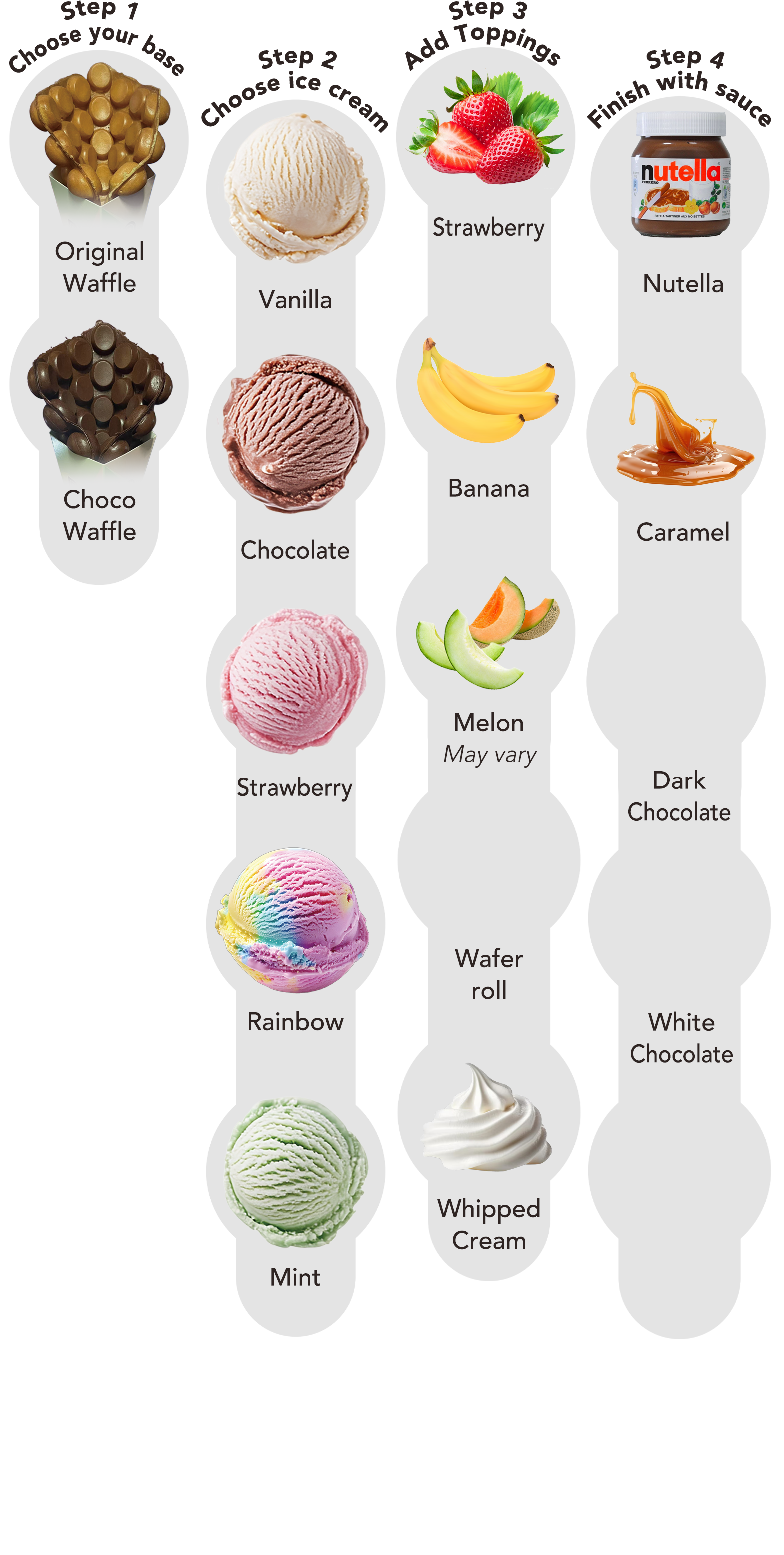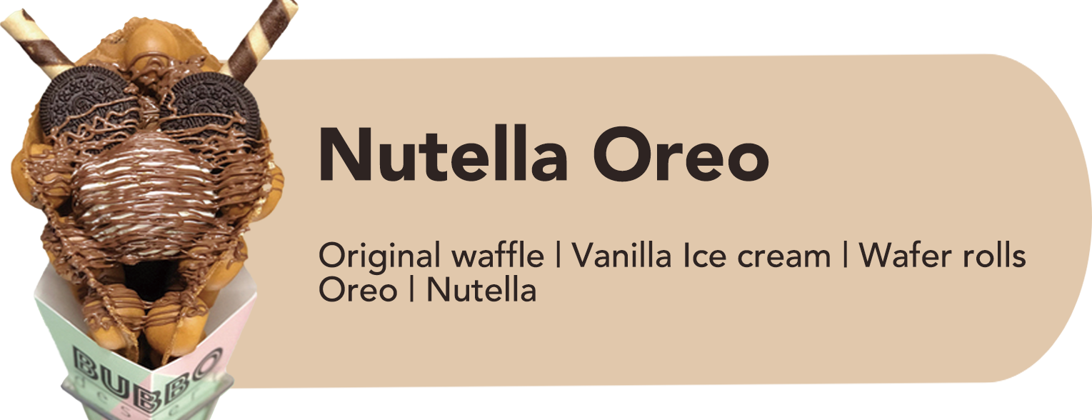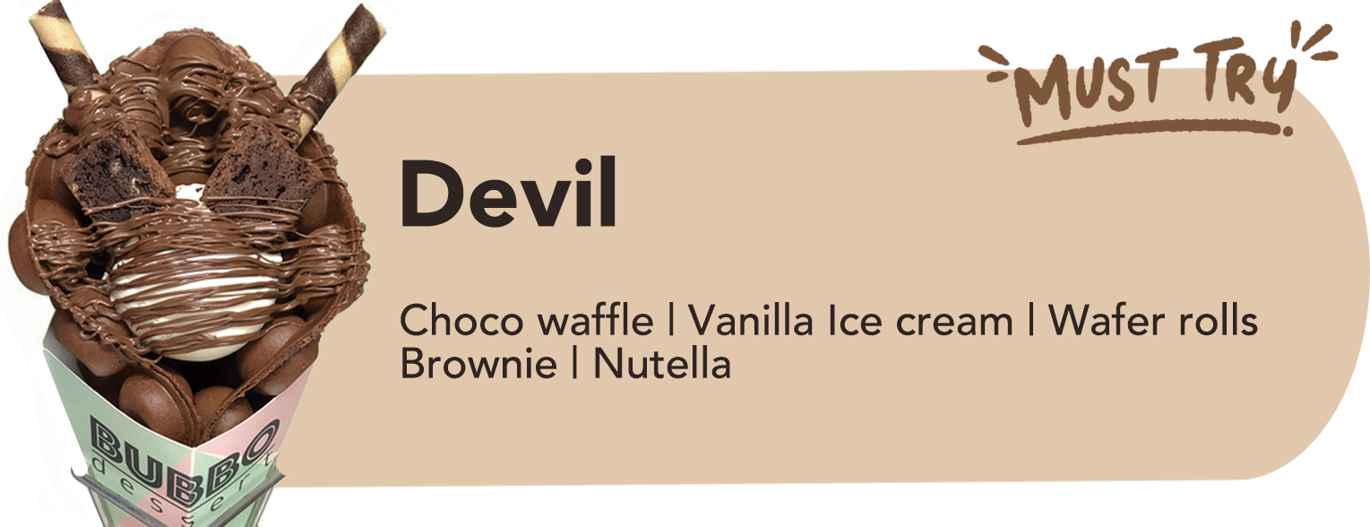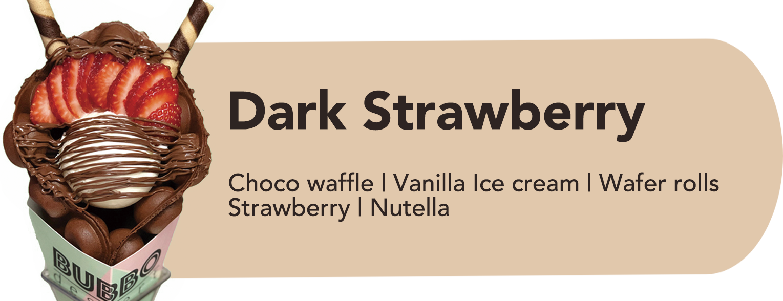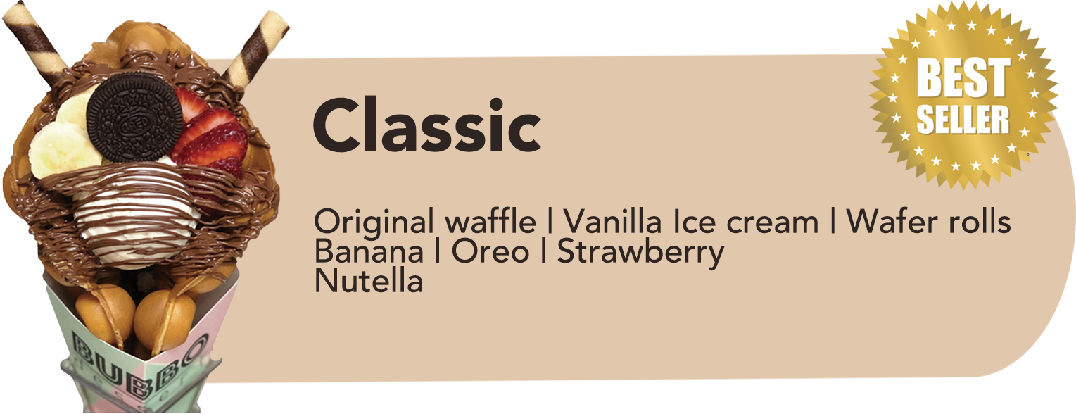 Well known for its crispy outside and chewy inside when served hot, the bubble waffle is conventionally eaten plain in Hong Kong, but at BUBBO dessert we are offering a wide range of creative BUBBO waffles โ combinations of flavoured waffle bases and assorted ice creams, sprinkled with various fruits and toppings. For our signature BUBBO combos, the bubbles are filled with all kinds of surprises such as Oreo crumbs and chocolate chips, which bring even more texture and fun! Take a look at our menu, and come visit soon to have a fun and yummy BUBBO waffle experience.